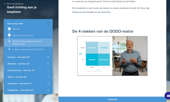 Wat krijgt iemand die de training volgt, bij gebrek aan een loopbaanbegeleider van vlees en bloed, dan wel? In ieder geval een strak ogend platform, stapsgewijs loodst het onlineprogramma je door de training heen. In totaal zijn er 6 modules en een introductie.