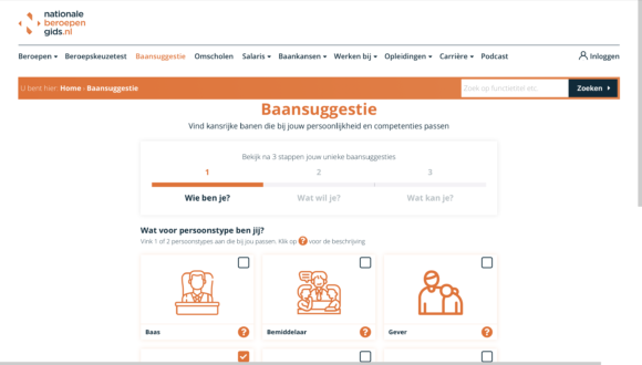 Het idee achter de tool is eenvoudig. Je vult allereerst in wat voor soort mens je bent: denk daarbij aan categorieën als ‘baas’, ‘bemiddelaar’ of ‘gever. In de volgende stap geef je aan welke sector jou aanspreekt; je kunt ook 2 sectoren selecteren. In de derde en laatste stap vink je minimaal 4 en maximaal 6 competenties aan. Die lopen uiteen van ‘aanpassingsvermogen’, ‘klantgerichtheid’ en ‘zelfontwikkeling’.