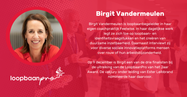 “Iedereen die een stap durft te zetten in z’n eigen ontwikkeling heeft in mijn ogen lef. Één coachee blijft me daarin speciaal bij, in mijn kennismaking met de jury van de LoopbaanPro Awards heb ik over hem verteld. Hij kwam vanuit NL Leert Door in m’n praktijk en voelde zich absoluut niet prettig op z’n werk. Hij wilde z’n baan opzeggen en had geen idee waarop hij moest gaan solliciteren.”