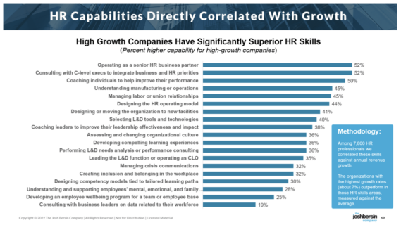 Zoomen we in op de cijfers? Dan zien we dat hr-professionals van snelgroeiende bedrijven gemiddeld 50% hoger scoren op de kwaliteit ‘coaching individuals to help their performance’. De kwaliteit staat daarmee in de top-3 van vaardigheden die een succesvolle hr’er beter beheerst dan een, we zullen er geen doekjes om winden, huis-tuin-en-keuken-hr-professional.