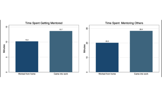Zoomen we in op de precieze getallen? Dan zien we dat mensen die naar kantoor komen dagelijks gemiddeld 28,4 minuten uittrekken om als mentor van hun collega’s te fungeren. Mensen die vanuit huis werken spenderen daarentegen gemiddeld 20,2 minuten aan het mentorschap. Dat betekent dat de thuiswerkers wekelijks 40 minuten minder vrijmaken voor een begeleidende rol dan hun collega’s op kantoor.